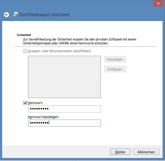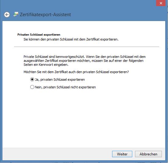 Folgen Sie dem Assistent für den Export des Zertifikats. Bitte achten Sie darauf, auch den privaten Schlüssel zu extrahieren, er ist für die Verschlüsselung von E-Mails notwendig.