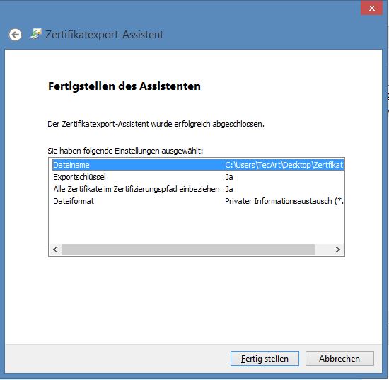 Im letzten Schritt können Sie das Zertifikat lokal abspeichern, somit steht einem Import in Ihr TecArt CRM nichts mehr im Wege.