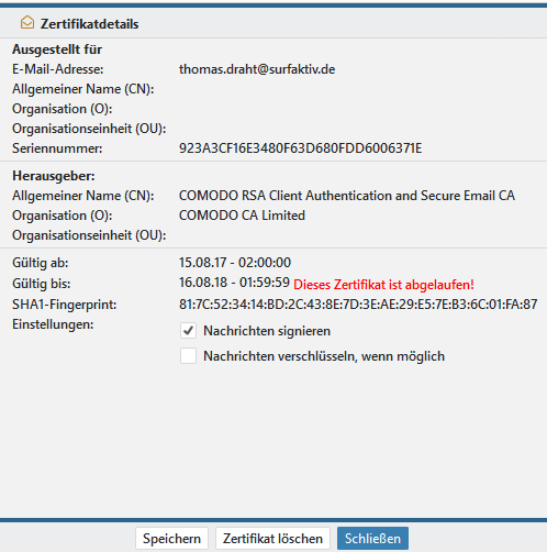 Aktuellstes Zertifikat NICHT zum Verschlüsseln verwenden Das aktuellste Zertifikat wird zum verschlüsseln einer E-Mail nicht verwendet.