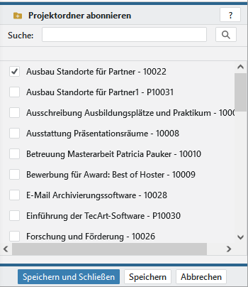 Suchen Sie in den Suchfeldern nach den gewünschten Kontakten bzw. Projekten und markieren Sie diese. Bestätigen Sie Ihr Abonnement mit oder nur , wenn Sie gleich weitere Objekte suchen wollen. Das E-Mail-Fenster wird danach aktualisiert und die abonnierten Kontakte oder Projekte werden in der Ordnerstruktur eingeblendet. Abonnierte Kontakte werden ocker und abonnierte Projekte grün dargestellt.