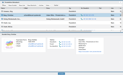Über das Modul Kontakte werden ausschließlich Unternehmenskontakte gepflegt. Sie haben über das persönliche im Modul die Möglichkeit, persönliche Kontakte zu pflegen, die im Grunde nichts mit dem Unternehmen zu tun haben müssen.
