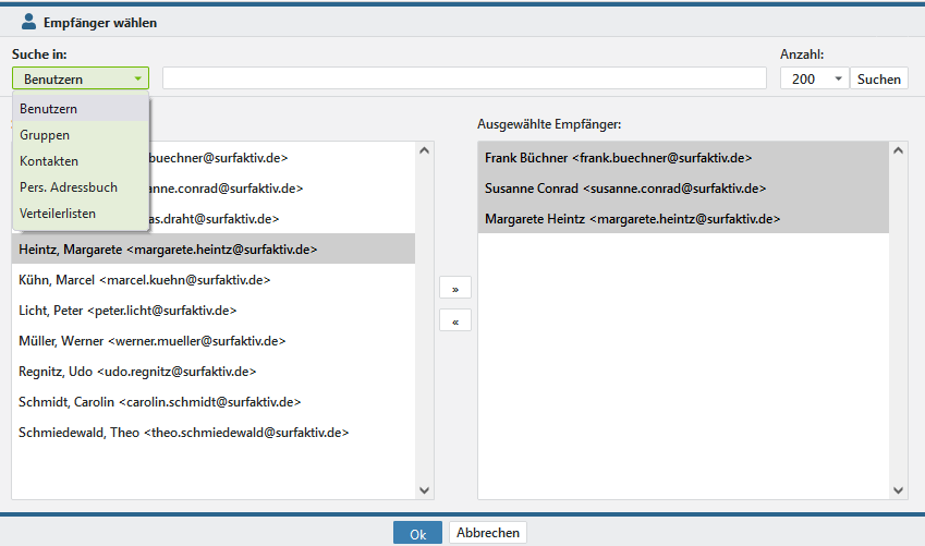 Es öffnet sich zunächst eine Suchmaske, in der Sie die entsprechenden Empfänger auswählen können. In den Suchergebnissen werden automatisch die Benutzer des TecArt CRM angezeigt. Wechseln Sie auf einen anderen Listeneintrag, werden Gruppe, Kontakte, persönliches Adressbuch und Verteilerlisten erst nach dem Klick auf angezeigt, gleich ob Sie schon ein Suchbegriff eingetragen haben. Markieren Sie in den Suchergebnissen die gewünschten Empfänger. Mit der Strg– oder der Shift-Taste können Sie mehrere Empfänger gleichzeitig markieren. Nutzen Sie anschließend oder , um sie auf die Seite der ausgewählten Empfänger zu bringen oder dort zu entfernen. Zum Löschen einer Adresse können Sie in der Liste den betreffenden Eintrag markieren und ihn über das Kontextmenü entfernen.