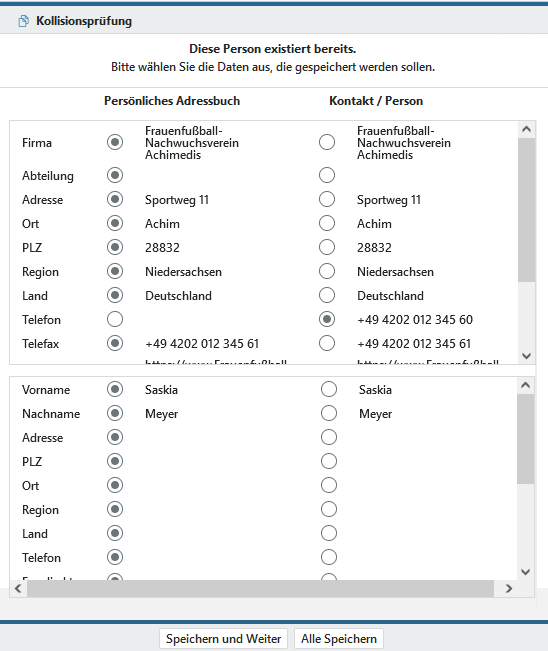 Weiterhin haben Sie die Möglichkeit, persönliche Kontakte Ihres Adressbuches als Kontakte/Personen anzulegen. Sie markieren einen entsprechenden Eintrag und wählen über das Kontextmenü und . Wurden in Ihrem Adressbucheintrag die Firma mit Adresse, PLZ und Ort abgespeichert und diese anhand der Dublettenprüfung gefunden, kann man verschiedene Daten miteinander abgleichen. Die aufgerufene Kollisionsprüfung zeigt Informationen zum Kontakt an, wenn dieser gefunden wird. Wird auch bereits ein Eintrag zur Person gefunden, werden auch diese Informationen angezeigt und man stellt die Verknüpfung zum öffentlichen Kontakt her mit dem möglichen Abgleich von Daten. Ergibt der Firmenvergleich keinen Treffer anhand der Dublettenprüfung, wird eine neue Firma angelegt inkl. der Person und diese wird automatisch abonniert. Man kann nun weitere Firmeninformationen direkt im öffentlichen Kontakt nachtragen. Für das Anlegen eines neuen Kontakts müssen verschiedene Felder ausgefüllt sein. Eine entsprechende Hinweismeldung folgt vor der Anlage.