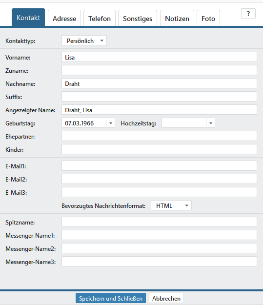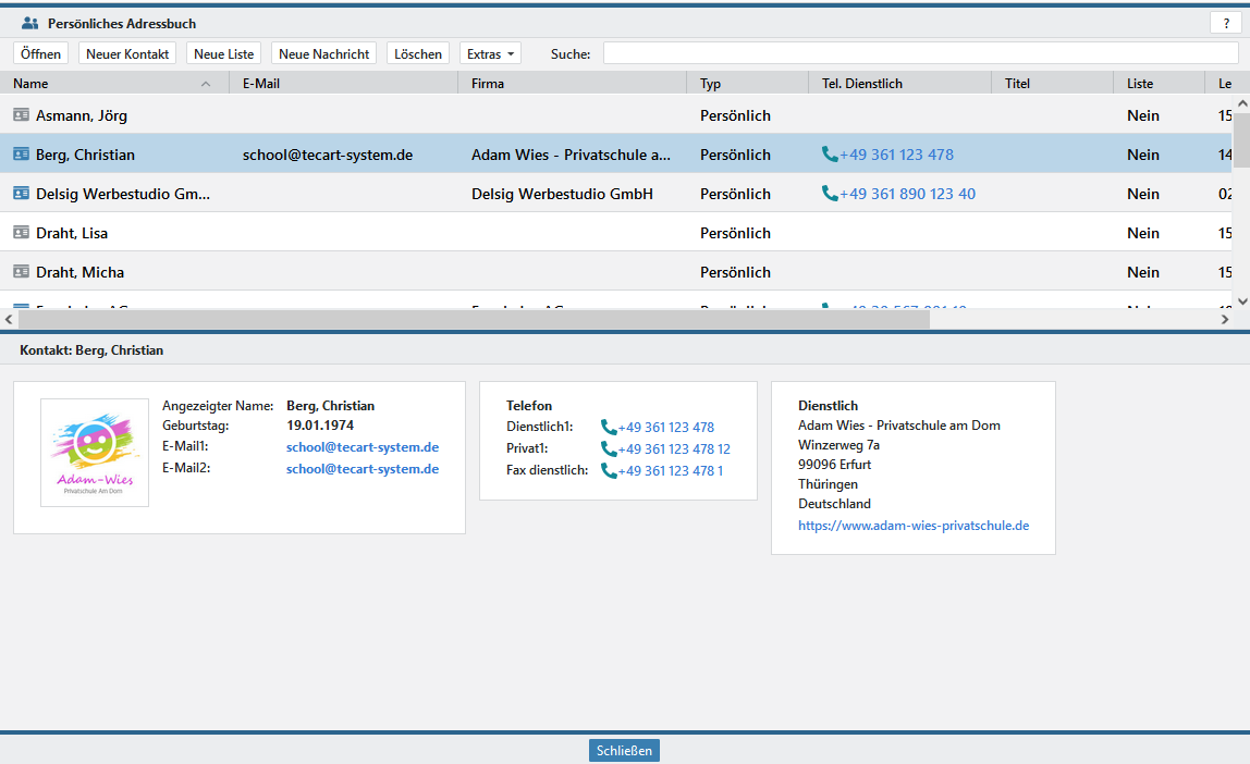 Einen neuen persönlichen Kontakt können Sie erstellen, indem Sie auf klicken. Möchten Sie einen vorhandenen Kontakt bearbeiten, markieren Sie ihn und nutzen oder rufen diesen mittels Doppelklick auf.