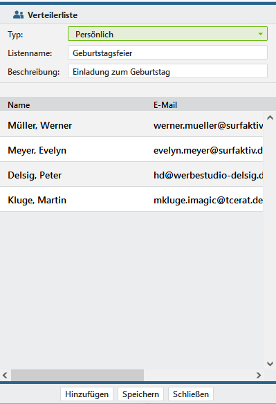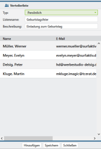 Über erstellen Sie neue E-Mail-Verteilerlisten. Möchten Sie eine vorhandene Liste bearbeiten, öffnen Sie diese durch einen Doppelklick auf den entsprechenden Eintrag oder nutzen Sie die Schaltfläche .