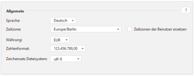 | Zahlenformat | Das Zahlenformat zeigt die landestypische Anzeige von Zahlen bei Geldbeträgen. Die hier vorgenommene Einstellung wirkt sich auch auf klassische Nummernfelder aus. |