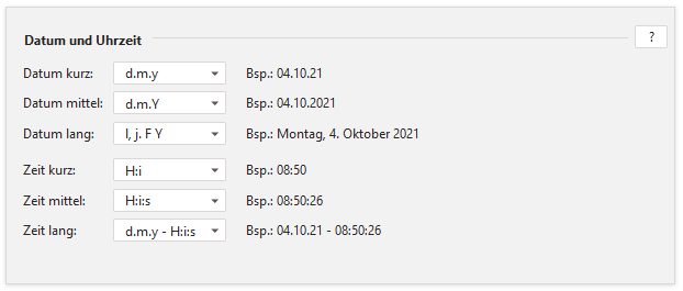 Im Abschnitt Datum und Uhrzeit stellen Sie je Feld ein, wie Sie diese angezeigt haben möchten. Die nachfolgende Tabelle zeigt Ihnen die mögliche Auswahl an. Diese Einstellungen können die Benutzer auch individuell über die persönlichen Einstellungen verändern. Die Einstellungen des Datumsformates für Tastenkürzel können nicht verändert werden.