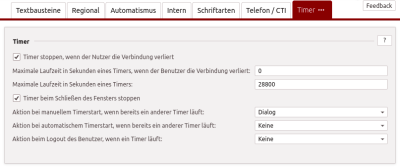 | Maximale Laufzeit in Sekunden eines Timers | Unabhängig anderer Einstellungen zum automatischen Stoppen des Timers können Sie hier eine maximale Laufzeit einstellen, die ein Timer nicht überschreiten darf. Bei 28800 Sekunden wird ein Timer automatisch nach 8 Stunden gestoppt. |
