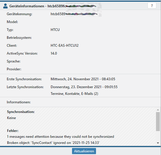 Neben einer Gerätekennung werden Ihnen in den Feldern häufig Informationen zu herstellerinternen Modelbezeichnungen des jeweiligen Endgerätes, Hardware-Revisionen, Betriebssystem mit Version (iOS, Android, Windows, etc.), Angaben zur Revision des ActiveSync-Protokolls, Sprache des Clients und durch Provider (Telekom, Vodafone, usw.) des Mobilfunkvertrages gebrandete Informationen ausgegeben. Darunter befinden sich weitere Informationen zur erstmaligen Synchronisation des Endgerätes sowie zur letztmaligen und aktuelle Statusinformationen, ob durch das ausgewählte Endgerät gerade eine Synchronisation durchgeführt wird, für welche Module diese erfolgt und ob dabei eventuell Fehler aufgetreten sind. |