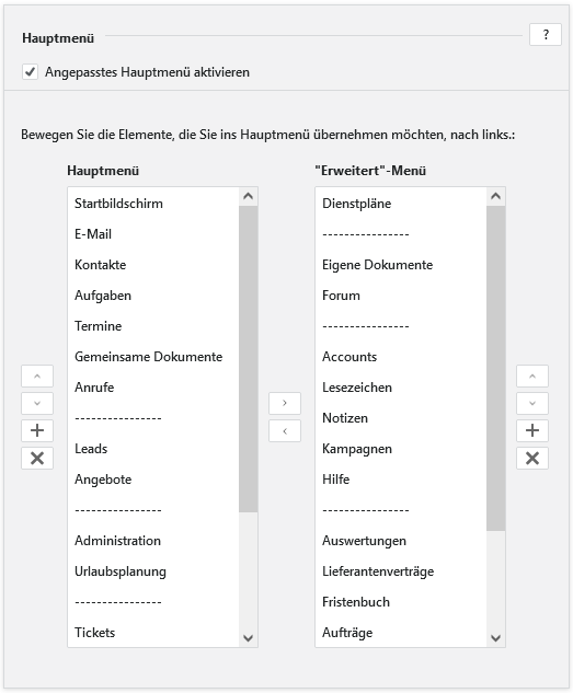 MehrAktivieren Sie im ersten Schritt das angepasste Hauptmenü durch das Setzen des Hakens Angepasstes Hauptmenü aktivieren.
