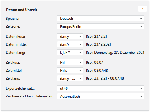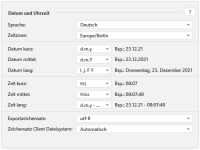 | Datum kurz Datum mittel Datum lang Zeit kurz Zeit mittel Zeit lang | Legen Sie fest, in welchem Format Datum und Zeit angezeigt werden sollen.