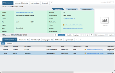 Gibt es noch keinen entsprechenden Kontakt, wird der Kontakt automatisch angelegt und geöffnet. Darüber hinaus werden die Ansprechpartner des Leads als Personen am Kontakt angelegt.