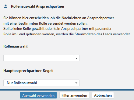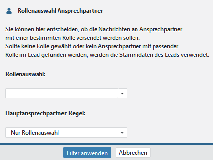 Definieren Sie die Rollen der Ansprechpartner, welche Sie anschreiben wollen. Sind die Rollen nicht gepflegt oder gibt es keinen Ansprechpartner, wird die E-Mail-Adresse des Leads genommen.