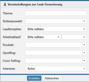 Dabei können Sie nun die Voreinstellungen für die Lead-Generierung vornehmen. Im Unterschied zur Generierung aus Kontakten, wird die Rolle nicht mehr abgefragt.