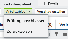 Die Arbeitsschritte können über den Button gewechselt werden. Dabei stehen je Arbeitsschritt die zuvor administrativ eingerichteten Übergänge zur Verfügung. Die Anzahl der Übergänge, wie auch die Anzeige des Button überhaupt, sind von den Berechtigungen zum Wechsel in den nächsten Arbeitsschritt abhängig. Ist ein Benutzer also nicht berechtigt von einem Arbeitsschritt in einen anderen zu wechseln, wird der Schritt oder Button nicht angezeigt.