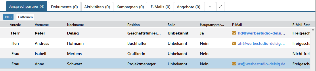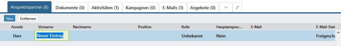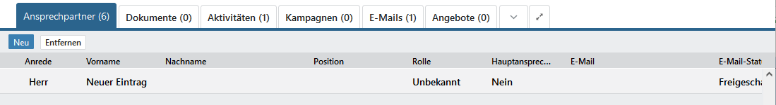 Sobald Sie außerhalb der Zeile des Ansprechpartners klicken, sind alle Daten gespeichert und der Bearbeitungsmodus wird verlassen.
