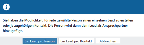 s öffnet sich eine Information zur Entscheidung, wie Sie die Leads erstellen möchten. Treffen Sie nun Ihre Entscheidung, ob oder erstellt werden soll. Bei letzterer Auswahl wird ein Lead pro Kontakt erstellt und sollten mehrere Personen eines Kontakts angeklickt gewesen sein, werden ausschließlich diese Ansprechpartner in den Lead übernommen.