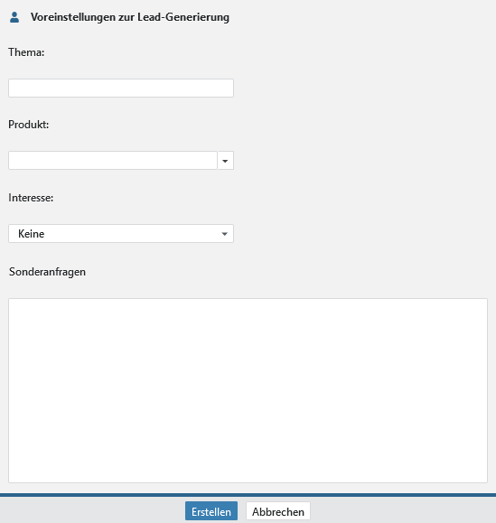 | Produkt | Diese Auswahl ist Optional eingeblendet und nur dann zu sehen, wenn das Feld in Ihren Leads bzw. dem Leadtemplate platziert ist. Enthält die Produktauswahlliste für diese Leads und befüllt dieses Feld. |