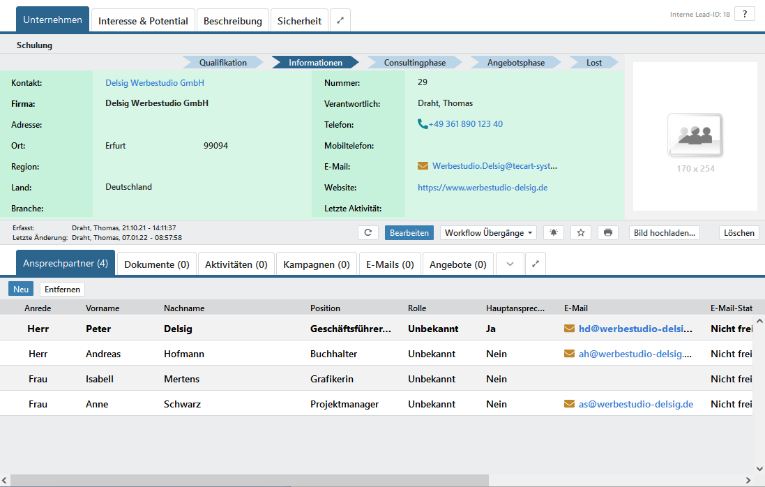 Im unteren Bereich jeweiligen Leads finden Sie viele Registerkarten mit weiteren Informationen des Leads. Auch diese Ansicht mit der Anzahl und Reihenfolge der Registerkarten kann sich von Ihrer persönlichen Ansicht unterscheiden.