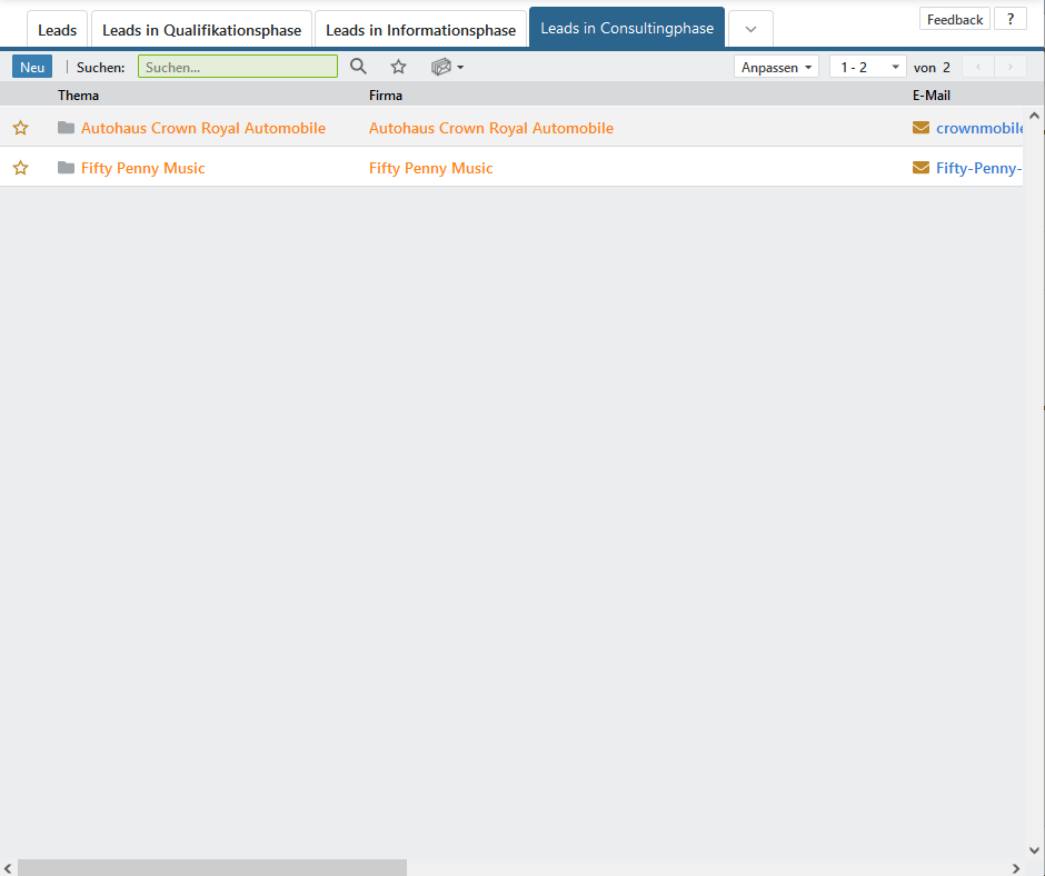 | Wenn Sie das Recht besitzen neue Leads anzulegen, steht Ihnen dieser Eintrag zur Verfügung, welcher einen neuen Datensatz im Bearbeitungsmodus erzeugt. |