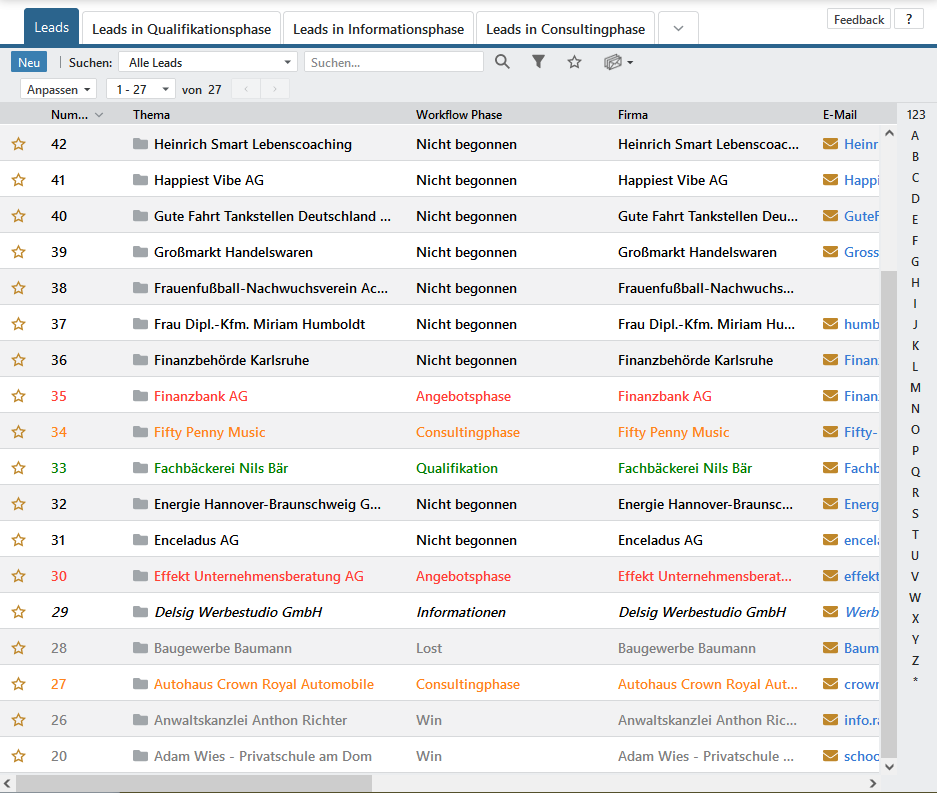 Leads können in verschiedenen Farben dargestellt werden. Mit der Buchung der Workflows und in Verbindung des jeweiligen Arbeitsschrittes, erfolgt die automatische Farbgebung. Da die Farben anhand des Arbeitsschrittes frei definiert werden können, gibt es in diesem Modul keine feste Farbgebung. Darüber hinaus kann jeder Übergang in einen neuen Arbeitsschritt ggf. weitere Funktionen auslösen.