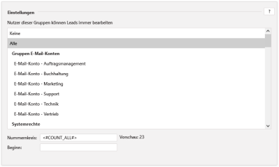 | Nummernkreis | In diesem Feld werden die Nummernkreise für die Leads definiert. Ein Standard ist dabei <#COUNT_ALL#>. Diese Variable ist für den Gesamtzähler da und erhöht die Leadnummer pro erstelltem Datensatz immer um eins. Hinweise zu weiteren möglichen Variablen finden Sie unten. Neben diesem Feld sehen Sie die Vorschau Ihrer Leadnummer nach dem .