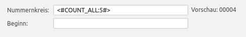 | Beginn | Geben Sie z.B. 10400 ein, startet die Hochzählung mit dem eingegebenen Wert, sofern der im System hinterlegte Zähler nicht bereits einen höheren Wert hat. Das Rücksetzen des Zählers ist nicht ohne Support möglich. |