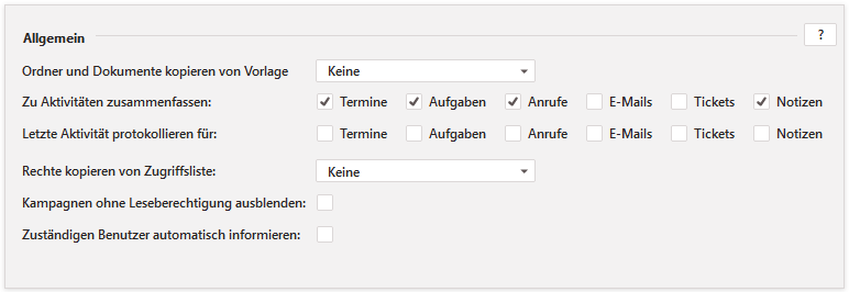| Letzte Aktivität protokollieren für | Möchten Sie das Datum der letzten Aktivität zu jedem Objekt im Feld Letzte Aktivität in den Kopfdaten ausgeben lassen, können Sie hier einstellen, welche Aktivitäten berücksichtigt werden sollen. Klicken Sie die gewünschten Auswahlfelder an. Das Feld finden Sie in der Felderverwaltung und müssen dieses ggf. einer Position zuweisen. |