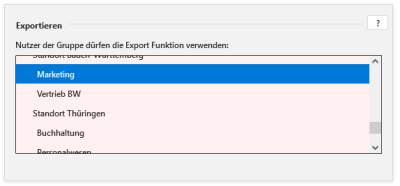 Der Export von Datensätzen in Form von CSV-Dateien aus dem System ist für die Masse von Daten generell allen Mitarbeitern untersagt. Sie können diese Funktion über die Gruppenauswahl im Abschnitt Exportieren im Feld Nutzer der Gruppe dürfen Export-Funktion verwenden aktivieren, indem Sie die gewünschten Gruppen markieren. Mehrere Gruppen können Sie durch die Strg-Taste auswählen.
