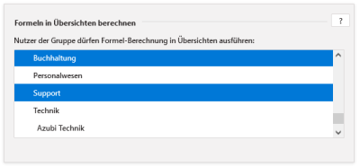 Über die Gruppenauswahl im Abschnitt Formeln in Übersichten berechnen können Sie die Gruppen festlegen, die in der Listenansicht des Moduls den Button zur Berechnung von Formeln angezeigt bekommen. Betätigt ein Benutzer diesen Button, erhält er die Auswahl , und . Wird , so werden alle Objekte und alle Felder, in welchem eine Formel über die Felderverwaltung eingetragen wurde, neu berechnet. Dabei kann es je nach Anzahl und Komplexität der Formeln sowie der Menge an Datensätzen zu einer hohen Auslastung und längeren Wartezeiten kommen. Die Option berechnet die Formeln nur von den aktuell gefilterten und angezeigten Datensätzen. Dadurch kann die Auslastung verringert werden. Wir empfehlen Ihnen generell, diese Funktion nur ausgewählten Benutzern freizuschalten.