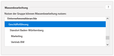 In diesem Feld legen Sie fest, welche Benutzergruppen mehrere Datensätze auf einmal in der Übersicht bearbeiten dürfen. Um mehrere Gruppen auszuwählen, halten Sie bitte die Strg-Taste gedrückt. Die Einschaltung erlaubt es den berechtigten Benutzern Feldinhalte, Sicherheitseinstellungen sowie Ordnerstrukturen inkl. der Sicherheitseinstellungen für eine Masse von Objekten zu ändern.