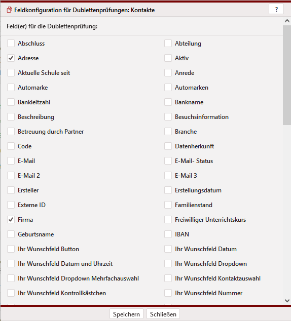 Über können Sie die Kriterien für die Neuanlage von Datensätzen festlegen. So können Sie bspw. für die Kontakte einstellen, dass Firma, PLZ und Ort als Prüffelder genutzt werden sollen. Zum Zeitpunkt der Einstellung werden Ihnen alle zur Verfügung stehenden Felder zur Auswahl angeboten. Wählen Sie die gewünschten Vergleichsfelder aus, um eine Dublette vom System erkennen zu lassen. Alle Auswahlkriterien werden miteinander kombiniert und bei einer exakten Übereinstimmung aller ausgewählten Felder mit einem neuen Objekt, wird dem Benutzer ein Hinweis auf Dopplung ausgegeben. Bestätigen Sie mit Ihre Einstellungen. Die in dieser Konfiguration vorgenommenen Einstellungen werden auch für externe Anwendungen, welche mittels Schnittstellen angebunden sind, angewendet.