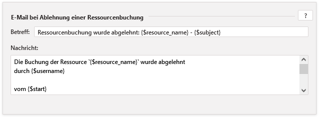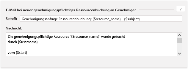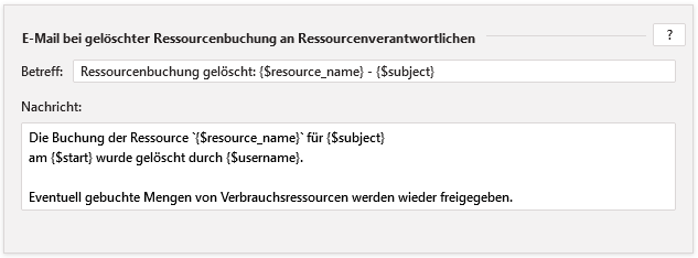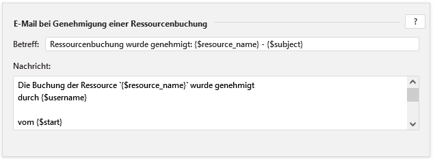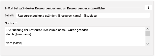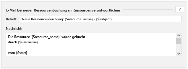 Wird eine neue Ressource gebucht, wird diese E-Mail an den Ressourcenverantwortlichen gesendet. Voraussetzung ist jedoch, dass in der entsprechenden Ressource eine Eintragung vorgenommen wurde, dass diese Information gesendet werden soll. Das Feld {$subject} im E-Mail-Text ist dabei ein automatischer Link.
