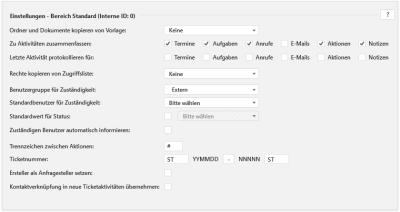 Im Bereich Einstellungen – Bereich können Sie im Rahmen der individuellen Einstellungen für jeden Ticket-Bereich die Einstellungen frei gestalten. Die hier vorgenommenen Beschreibungen sind Experteneinstellungen und nur für wenige Anwendungsfälle interessant. Im Vorfeld können Sie gern mit unseren Experten Ihre genauen Vorstellungen zur Abarbeitung besprechen.