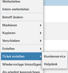 Ist ein Benutzer des Ticket-Systems in mehreren Gruppen der Bereiche Mitglied, kann er für jeden Bereich Tickets erzeugen. Tickets aus E-Mails oder über die Ticketübersicht kann dieser dann über die entsprechenden Menüs aufrufen. Die tatsächliche Anzeige der jeweiligen Tickets für den Benutzer regeln Sie allein über Rechteeinstellungen bzw. entsprechende Filterfunktionen.