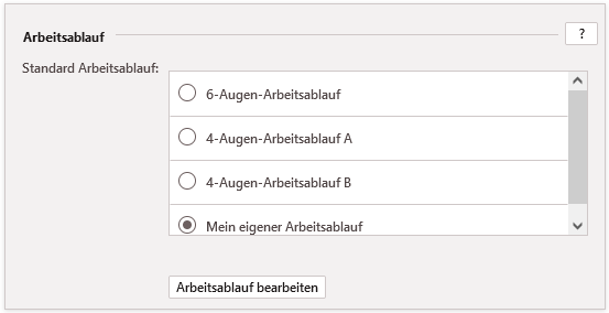Im Abschnitt Arbeitsablauf legen Sie einen Standard-Arbeitsablauf für dieses Modul fest. Betrachten Sie diesen als „Backup“, sollten Sie mehrere Arbeitsabläufe angelegt haben. Arbeitsabläufe lassen sich generell sehr individuell einstellen und anhand von Regeln auch neuen Objekten automatisch zuweisen.