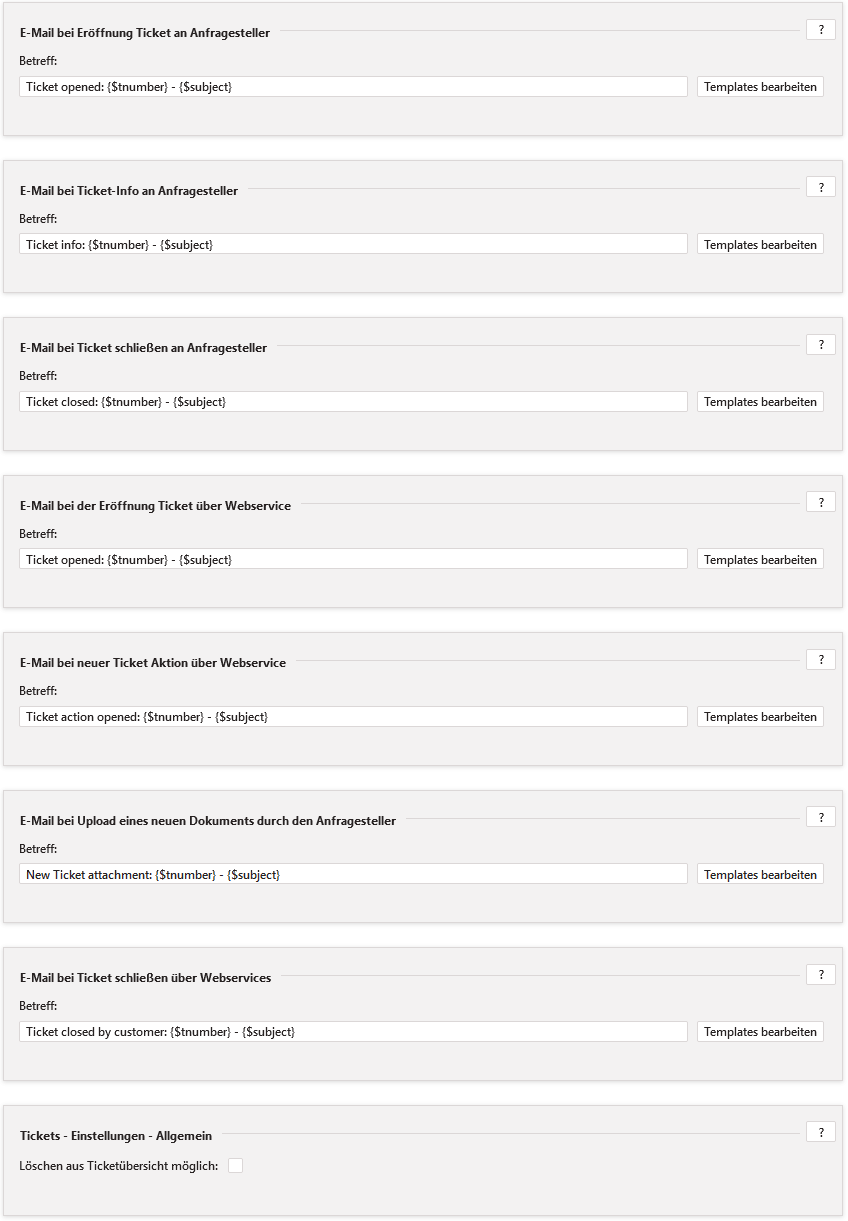 In den nachfolgenden Abschnitten finden Sie eine Reihe von Einstellungsmöglichkeiten für Ihre E-Mails in verschiedenen Bearbeitungsstatus sowie individuell für jeden Ihrer Ticketbereiche. Dabei können Sie für jeden Ticketbereich individuelle Vorlagen erstellen und Werte sowie Felder setzen. Innerhalb der Vorlagen haben Sie Zugriff auf alle Datenfelder des jeweiligen Tickets und können diese damit in Betreffs und Inhalten der E-Mails verwenden.