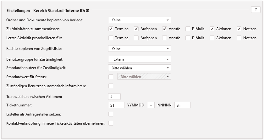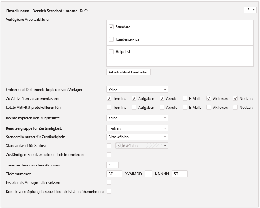 Im Bereich Einstellungen – Bereich können Sie im Rahmen der individuellen Einstellungen für jeden Ticket-Bereich die Einstellungen frei gestalten. Die hier vorgenommenen Beschreibungen sind Experteneinstellungen und nur für wenige Anwendungsfälle interessant. Im Vorfeld können Sie gern mit unseren Experten Ihre genauen Vorstellungen zur Abarbeitung besprechen.