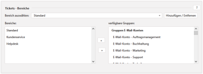 Über das Dropdown-Feld Bereich wählen finden Sie eine Liste der bereits eingerichteten Bereiche. Wählen Sie den entsprechenden Bereich aus, für welchen Sie Einstellungen vornehmen möchten. Gibt es noch keine weiteren Bereiche, so können Sie über den Button die Gruppenauswahl ein-/ausblenden und aus den verfügbaren Gruppen diese zu einem Bereich machen. Jede hinzugefügte Gruppe entspricht dem Namen des Ticketbereiches und wird darüber auch als Template in der Felderverwaltung verfügbar gemacht. Bitte beachten Sie, dass beim Löschen eines Bereiches alle Einstellungen und Informationen, jedoch nicht die Tickets verloren gehen.