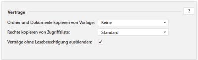 | Ordner und Dokumente kopieren von Vorlagen | Haben Sie für dieses Modul Ordnervorlagen erstellt, können Sie an dieser Stelle eine Standardvorlage auswählen. Diese wird dann herangezogen, wenn ein Benutzer die Auswahl zwischen mehreren oder keinen vorgegebenen Strukturen hat. Wählen Sie an dieser Stelle Keine, werden die Standardrechte für jeden Vertrag aus den Rechteeinstellungen der Dokumente übernommen. |