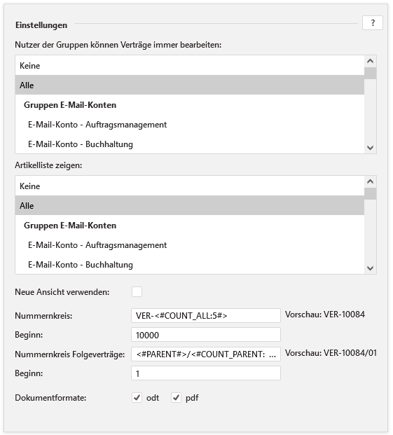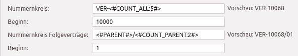 | Nummernkreis | In diesem Feld werden die Nummernkreise für die Verträge definiert. Ein Standard ist dabei <#COUNT_ALL#>. Diese Variable ist für den Gesamtzähler da und erhöht die Vertragsnummer pro erstelltem Datensatz immer um eins. Hinweise zu weiteren möglichen Variablen finden Sie unten. Neben diesem Feld sehen Sie die Vorschau Ihrer Vertragsnummer nach dem .