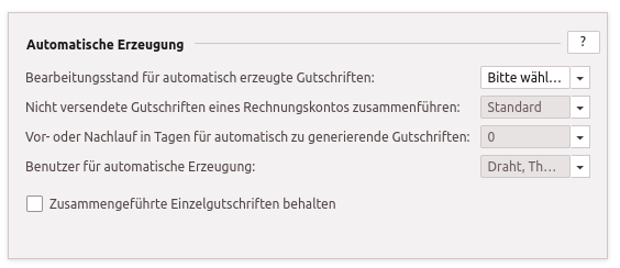 Werden Gutschriften automatisch erzeugt oder manuell angelegt, so wird durch diese Einstellung bestimmt, ob die jeweiligen Vorgänge zusammengefasst werden oder nicht. Dabei orientiert sich die Einstellung an generellen Einstellungen über die Registerkarte Rechnungskonten sowie individuellen Einstellungen innerhalb eines ~Link~Rechnungskontos.