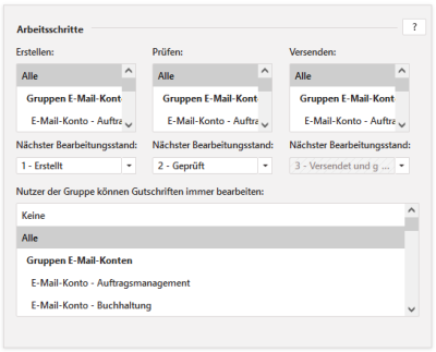 Ein besonderes Recht können Sie über die Gruppenauswahl im Feld Nutzer der Gruppe können Gutschriften immer bearbeiten festlegen. Dabei handelt es sich um die Möglichkeit, bis zum Versand und der damit verbundenen Verbuchung des Vorgangs, Änderungen in jeder einzelnen Bearbeitungsstufe vornehmen zu können. Insbesondere an Daten des Vorgangs selber, Änderung von Einstellungen, bis hin zum Kontakt oder Rechnungskonto.