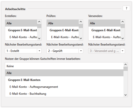 Ein besonderes Recht können Sie über die Gruppenauswahl im Feld Nutzer der Gruppe können Gutschriften immer bearbeiten festlegen. Dabei handelt es sich um die Möglichkeit, bis zum Versand und der damit verbundenen Verbuchung des Vorgangs, Änderungen in jeder einzelnen Bearbeitungsstufe vornehmen zu können. Insbesondere an Daten des Vorgangs selber, Änderung von Einstellungen, bis hin zum Kontakt oder Rechnungskonto.