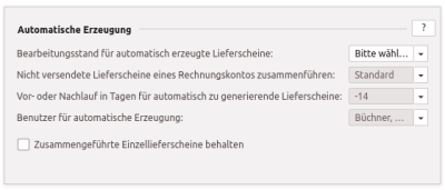 Werden Lieferscheine automatisch erzeugt oder manuell angelegt, so wird durch diese Einstellung bestimmt, ob die jeweiligen Vorgänge zusammengefasst werden oder nicht. Dabei orientiert sich die Einstellung an generellen Einstellungen über die Registerkarte Rechnungskonten sowie individuellen Einstellungen innerhalb eines ~Link~Rechnungskontos.