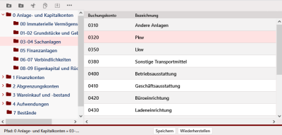 Um neue Buchungskonten anzulegen oder vorhandene zu ändern, wählen Sie über die Ordnerstruktur den gewünschten Abschnitt aus. Über das Kontextmenü oder das Icon Hinzufügen können Sie ein neues Buchungskonto erstellen. Vorhandene Buchungskonten können Sie über einen Doppelklick öffnen und verändern.