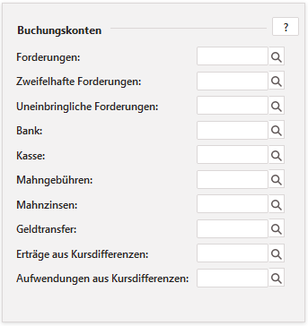 Der Kontenrahmen dient Ihnen zur Orientierung der zu bebuchenden Buchungskonten und für eine Auswahl von angelegten Buchungskonten in entsprechenden Feldern. Sie müssen keinen Kontenrahmen importieren, wenn Ihnen alle Buchungskonten bekannt sind. Legen Sie hier Konten fest, sind diese über die Lupe neben jedem Feld der Buchungskonten abrufbar.