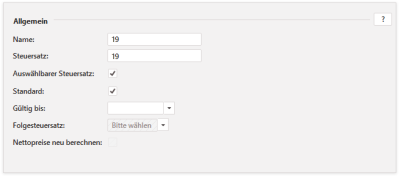 | Folgesteuersatz | In Abhängigkeit eines Ablaufdatums für einen Steuersatz wählen Sie an dieser Stelle den neuen Folgesteuersatz aus. Sollten Sie diesen noch nicht angelegt haben, legen Sie diesen zuvor an.