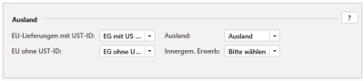 | Ausland | Handelt es sich in der Länderangabe des Rechnungskontos um kein Land der EU, dann ist der hier festgelegte Steuersatz ausschlaggebend für die Rechnungen. Dabei ist die Eintragung einer USt-ID unerheblich. |