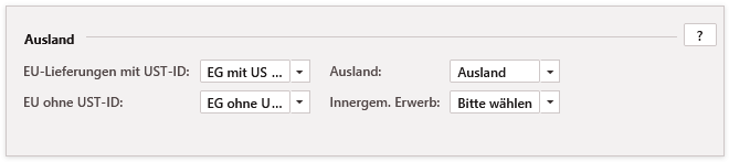 Um nun den Alternativen den entsprechenden auswählbaren Steuersätzen zuzuweisen, markieren Sie links zunächst den gewünschten Steuersatz (z.B. 7% oder 19%) und wählen im Abschnitt Ausland die gewünschten Steuersätze aus.